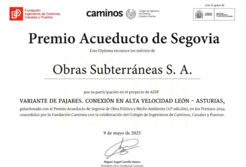 OSSA ha sido reconocida por su participación en el proyecto de ADIF “Variante de Pajares. Conexión en Alta Velocidad León – Asturias”, proyecto galardonado con el Premio Acueducto de Segovia de Obra Pública y Medio Ambiente (11ª edición) concedido por la Fundación Caminos con la colaboración del Colegio de Ingenieros de Caminos, Canales y Puertos.